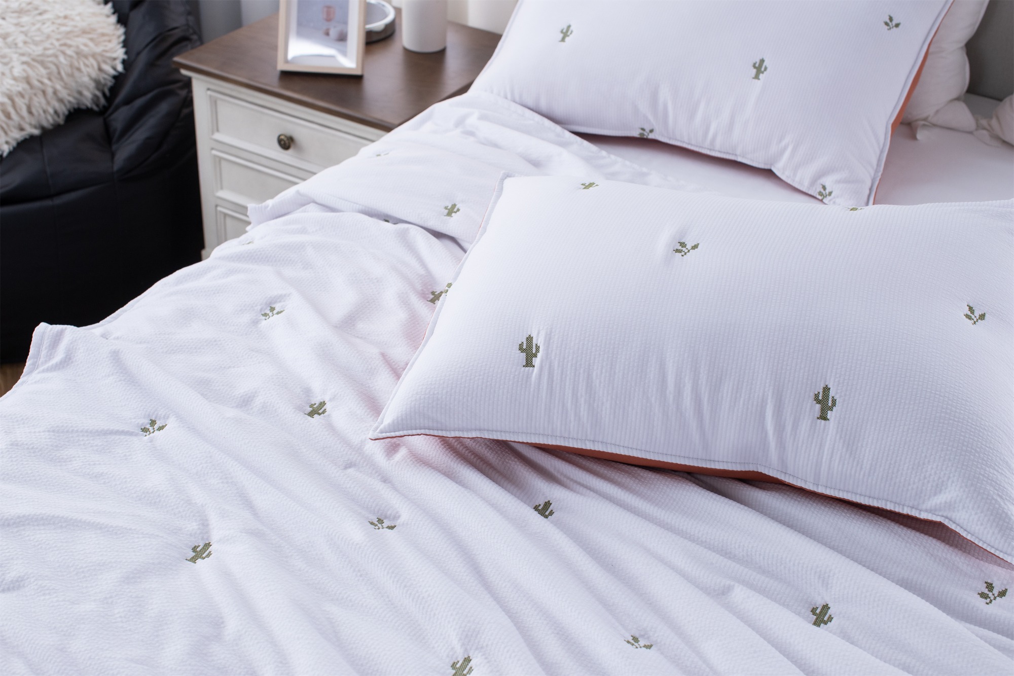The pixel-style embroidery adds a playful and modern touch, bringing character and visual fun to everyday home textile.